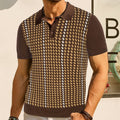 Men's Short-Sleeve Fine Knit Polo Tee - Point Collar Two-Button Placket Houndstooth Jacquard Panel Casual Style
