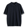 Men's Short-Sleeve Fine Knit Polo Tee - Spread Collar Quarter-Zip Placket - Vertical Ribbed Stripe Panel - Contrast Tipped Cuffs Smart Casual Style