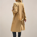 Refined and effortlessly chic, this camel long coat brings timeless sophistication to cold-weather dressing. Featuring a classic belted waist and structured lapel design, it flatters the silhouette while adding warmth and polish. Ideal for both casual strolls and evening outings, it pairs perfectly with boots and fine knitwear for a modern, elevated look.