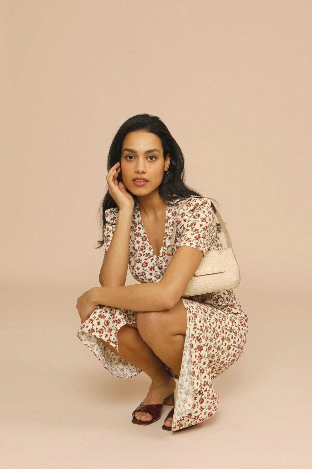A quiet celebration of refinement, this flowing midi dress brings graceful movement and soft structure to warmer days. The V-shaped neckline draws the eye with subtle confidence, while the delicate floral motif offers a fresh yet timeless charm. Ideal for garden parties, daytime events or leisurely moments where style meets ease, this piece balances femininity with an effortless sense of composure.