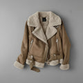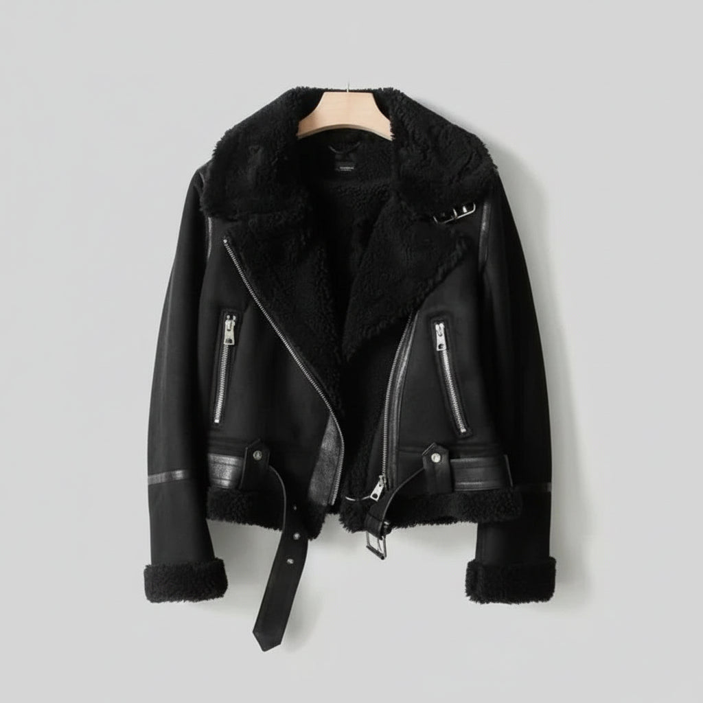 Women’s Shearling Biker Jacket – Sherpa Lined with Belted Hem