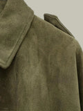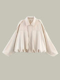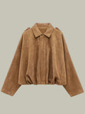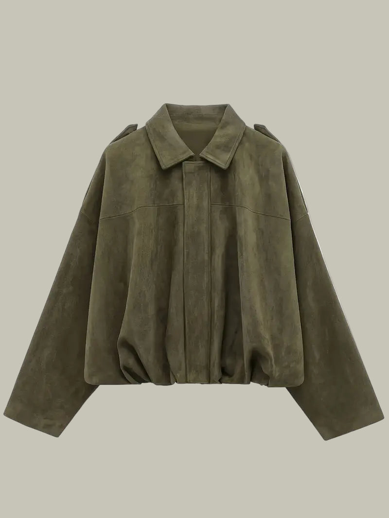 A modern layer with retro ease, this short jacket brings soft, faux-suede texture and a relaxed, oversized drape. The clean spread collar and concealed front keep the silhouette minimal, while the gathered hem creates a flattering blouson shape that works over tees, knits and dresses. Effortless to style for coffee runs, city strolls and laid-back evenings.