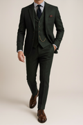Step into understated elegance with this classic green three-piece tuxedo, defined by its sharp tailoring and traditional silhouette. Comprising a structured blazer, coordinating waistcoat, and matching trousers, the ensemble is designed for occasions that call for formality and distinction.