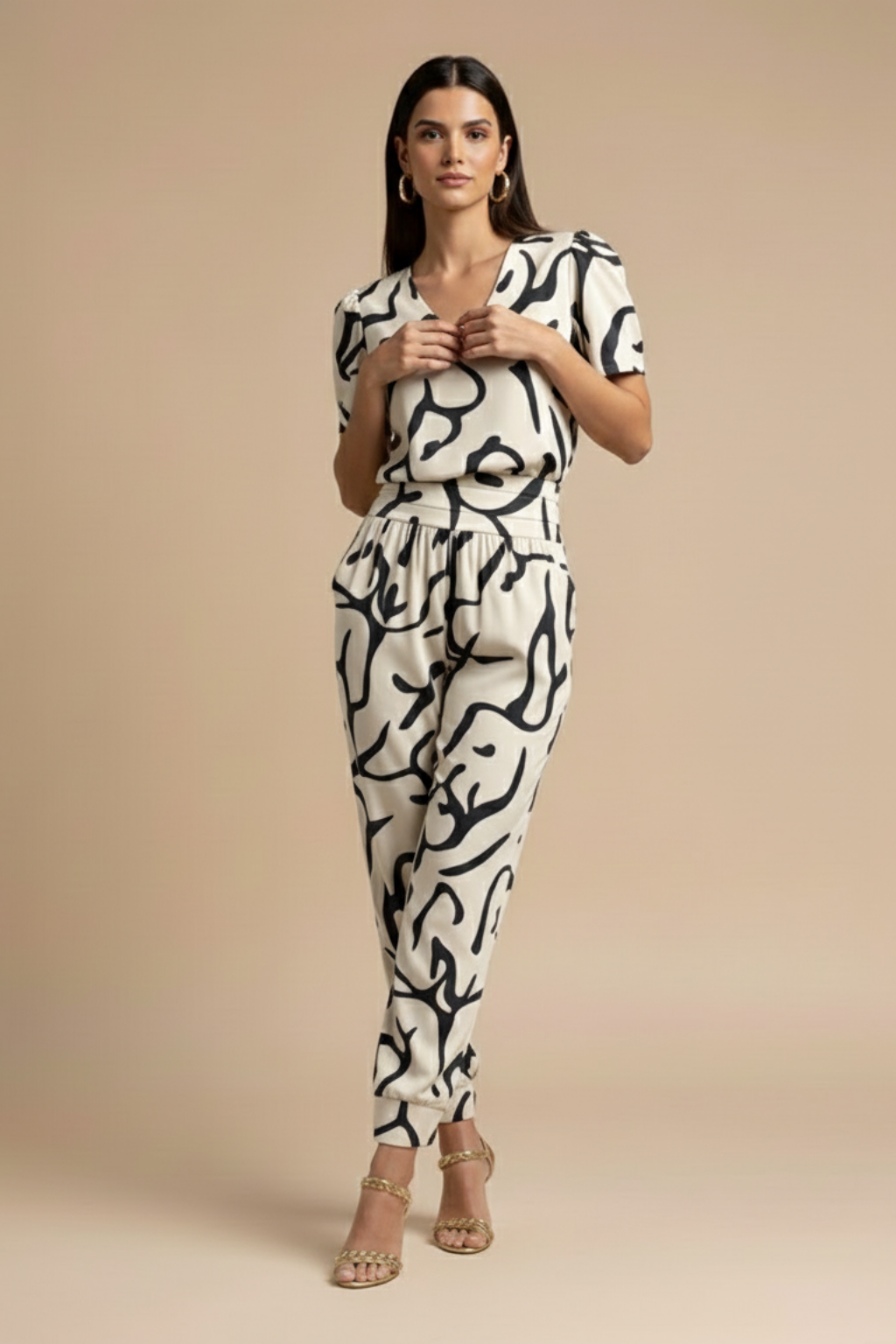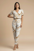 Modern and easy to wear, this coordinated set brings polish without feeling overdone. The clean V-neck blouse keeps the look light and refined, while the patterned trousers add visual interest with a flattering, relaxed line. Ideal for days that move from casual plans to more considered moments, offering effortless style with a composed finish.