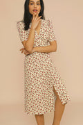 A quiet celebration of refinement, this flowing midi dress brings graceful movement and soft structure to warmer days. The V-shaped neckline draws the eye with subtle confidence, while the delicate floral motif offers a fresh yet timeless charm. Ideal for garden parties, daytime events or leisurely moments where style meets ease, this piece balances femininity with an effortless sense of composure.