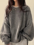 Design: Oversized pullover sweater with round neck, lantern sleeves, and ribbed cuffs and hem
