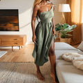 Women’s Linen Midi Dress – V-Neck – Open Back – Adjustable Tie Straps – Side Slit