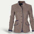 A refined layer that blends structure with ease, this tailored short blazer features a sharp stand collar and precise seam work for a flattering, fitted profile. The curved hemline and angled flap pockets create a contemporary silhouette, while contrast piping adds subtle definition. Perfect for elevating smart casual ensembles, it transitions seamlessly from weekday meetings to weekend gatherings.