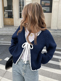 Women’s Tie-Front Cardigan – Cropped Knit Layer with Contrast Trim